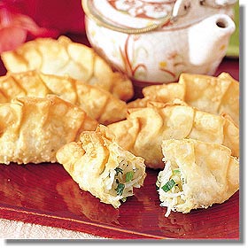 ギョウザの皮以外に、ワンタンの皮や春巻きの皮で作ってもよい。 |