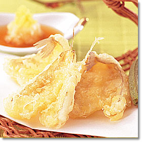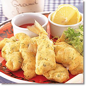 | 一般に出まわっているのはシロギスと呼ばれるもので、名前通り色が白いのが特徴。英名では「Japa-nese whiting」と呼ばれています。脂質が少なく淡泊な味で、江戸前の天ぷらには欠かせない日本の味です。開いて冷凍にしたものが多いので、水分をよく拭き取ってから調理しましょう。 |