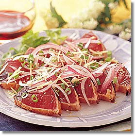 | 初夏の味覚の代表でもあるかつお。「目に青葉 山ほととぎす 初鰹」の句もお馴じみで、江戸時代は辛子みそで食べるのが定番だったとか。かつおはおいしいだけでなく栄養価も高く、善玉コレステロールを増やすEPA「エイコサペンタエン酸」が多く含まれ、血合いにはビタミンB1、B2が豊富です。 |