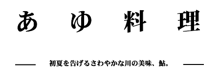 | 稚鮎の天ぷら | 鮎の田楽みそ焼き | 鮎のパン粉焼き | 鮎ごはん | 鮎の甘露煮 | ||||||