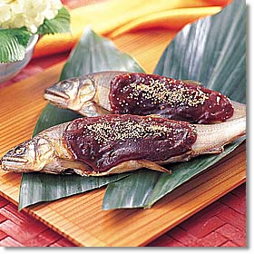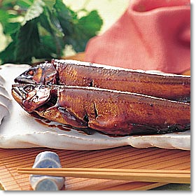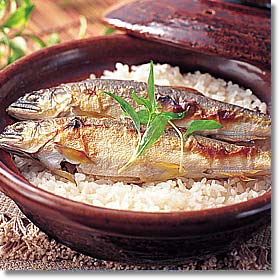 | 気品のある姿のよさと淡泊な味わいの鮎。日本の淡水魚の代表でもあり、古くから詩歌や絵画などの題材として親しまれてきました。鮎は川底の水ごけを食べるので香りが良く、内臓で作った塩辛の「うるか」も美味とされています。 |