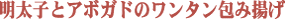 | 手作り辛子明太子 | たらこと長いもソースドリア | 生たらこの炊き合わせ | 明太子とブロッコリーの和え物 | 明太子とアボガドのワンタン包み揚げ | ||||||