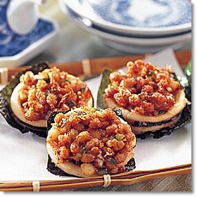 | 日本近海で獲れるいかの漁獲量の半分以上をしめるのが「するめいか」。東シナ海に生まれて、日本列島沿いに南下する秋から冬が美味とされています。「寿留女」と書いて婚約・結婚の祝い用に使われるのは、花嫁が逃げ出さずに末永く留まってくれるようにとの願いから。一時、いかにはコレステロールを高める成分があるといわれていましたが、その後の学説で逆にコレステロールを下げる働きのあるタウリンが豊富であると判明しました。 |