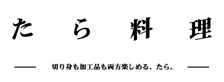 | 淡泊な味わいが上品で、鍋物や焼き物にぴったりのたらですが、いたみやすいのが困りどころです。そのため昔から塩だら、棒だら、すき身だら、でんぶなどの加工品が多く作られてきました。スペインやポルトガルでも干しだらが有名です。加工品は塩分が強いので、調味料を減らすなどの加減が必要です。 |
